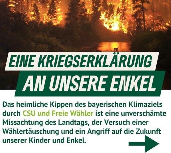Diese Politik von Markus Söder ist eine Kriegserklärung an unsere Enkel. Während eine Großstadt aktuell von Feuerwalzen vernichtet wird, betätigt sich die bayerische Staatsregierung als Brandbeschleuniger. Das ist unverantwortlich! Die Klimaerhitzung hat begonnen. Die Ereignisse auf der Welt sind erst ein winziger Vorgeschmack auf das, was unsere Kinder und Enkel erwarten wird. Unsere Generation hat eine zentrale Aufgabe zu erfüllen: die Erhaltung der Bewohnbarkeit unseres Planeten. Und dafür müssen wir ganz konkret so schnell wie möglich aufhören, fossile Brennstoffe zu verbrennen. Es braucht klare Ausstiegsstrategien, um zu einem klaren Datum die Verbrennung von Benzin, Diesel, Heizöl, Gas und Kohle restlos zu beenden. Dieser Weg muss politisch gestaltet werden, gerne technologieoffen, gerne mit weitreichenden Förderungen, aber konsequent und unverzüglich.