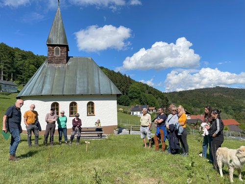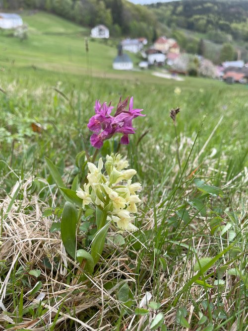 Zu einem kleinen Orchideenfest traf sich der Grünen-Ortsverband Sonnenwald-Dreiburgenland auf Einladung von Heidi Schuberl in Daxstein. Hier ist ein ökologischer Hotspot der Artenvielfalt, der durch extensive und traditionelle Bewirtschaftungsmethoden erhalten und sogar verbessert werden konnte. Der Landschaftsökologe Ernst Obermeier entdeckte dieses Kleinod vor 38 Jahren im Rahmen seiner Diplomarbeit. Sechs verschiedene Arten von heimischen Orchideen und eine Reihe weiterer Arten der Roten Liste blühen auf der Wiese oberhalb der Kapelle in Daxstein - alle streng geschützt. Eine Art ragt in ihrer Bedeutung noch einmal heraus, weil sie besonders selten ist, das Holunder-Knabenkraut.