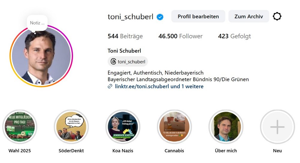 Der grüne Landtagsabgeordnete Toni Schuberl konnte nach eigenen Angaben innerhalb eines Jahres von anfangs nur 1.200 Followern auf Platz 2 in Niederbayern aufsteigen mit nun 44.800 Followern. Er hat damit nicht nur den Chef der größten Fraktion im Europaparlament Manfred Weber von der CSU mit 33.500 Followern überholt, sondern auch die AfD deklassiert. Lediglich Hubert Aiwanger liegt als Politiker in Niederbayern mit 63.500 Followern noch vor ihm.