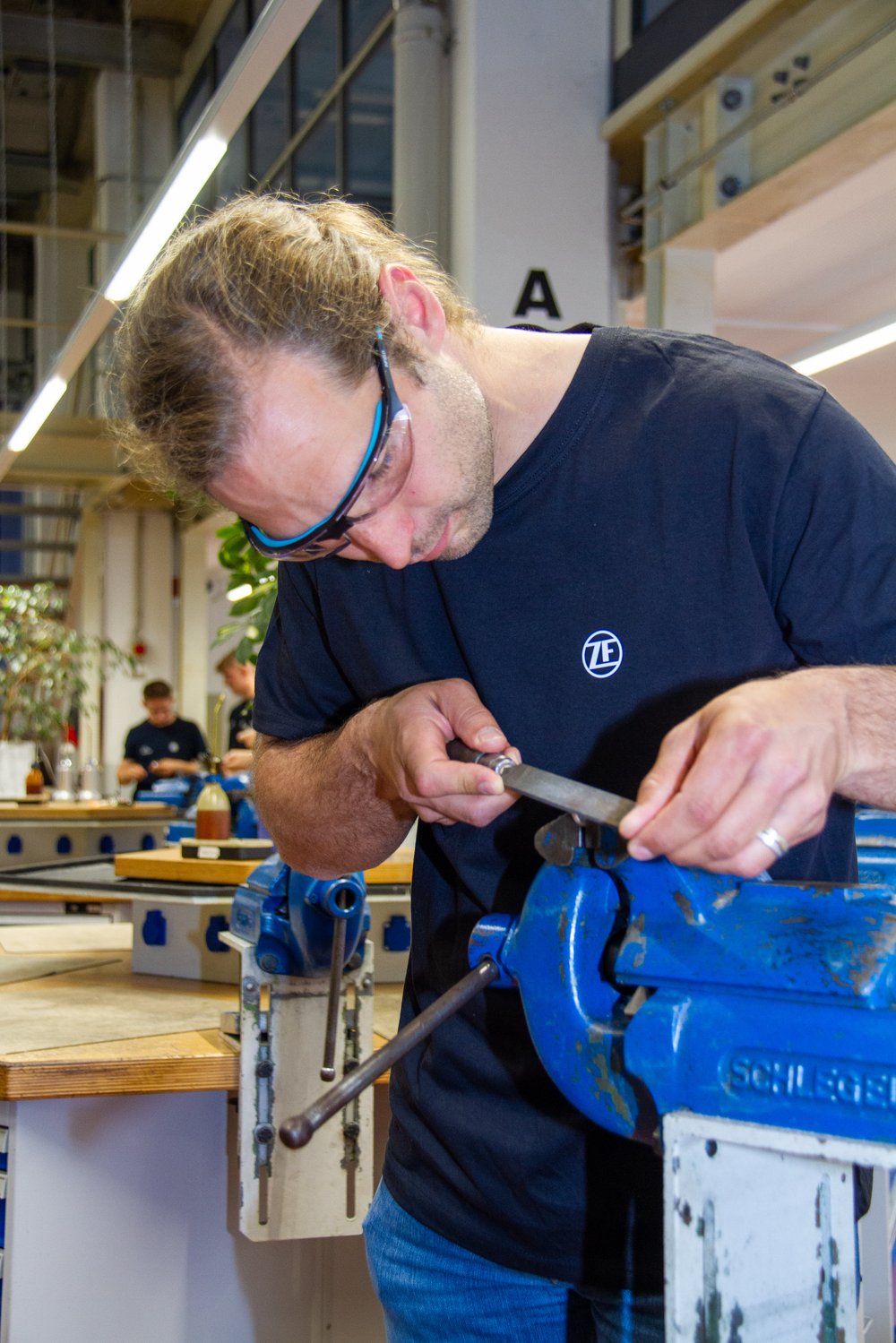 Im Ausbildungszentrum erhielt Schuberl zunächst einen Einblick in den Arbeitsalltag der ZF-Azubis und durfte sich auch selbst an der ein oder anderen handwerklichen Herausforderung beweisen: Neben einer Einführung in die Funktionsweise und Bedienung eines Industrieroboters erwartete den Landtagsabgeordneten auch eine kurze Unterweisung zur Metallbearbeitung mittels Feile von ZF-Azubi Julian Zillner. Das neu erworbene Wissen wurde auch umgehend in die Praxis umgesetzt.