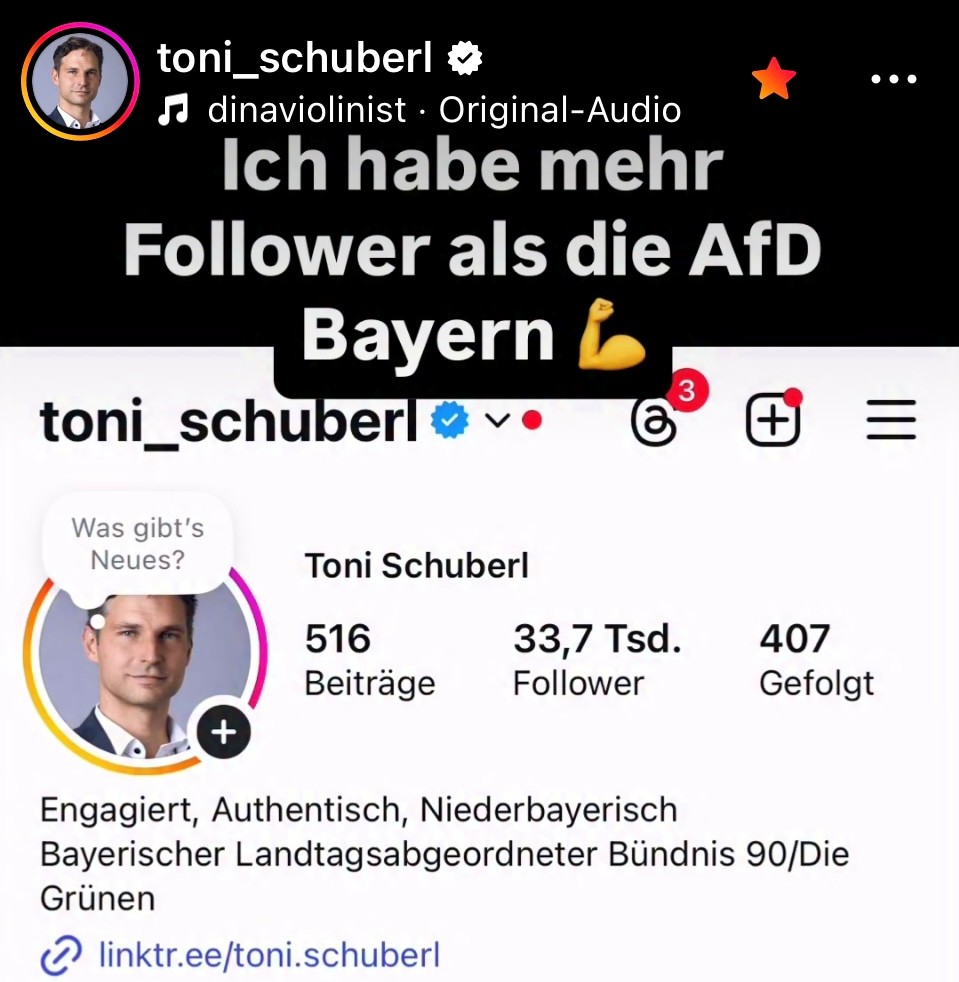Der grüne Landtagsabgeordnete Toni Schuberl konnte nach eigenen Angaben innerhalb eines Jahres von anfangs nur 1.200 Followern auf Platz 2 in Niederbayern aufsteigen mit nun 33.400 Followern. Er hat damit sogar den Chef der größten Fraktion im Europaparlament Manfred Weber von der CSU mit 33.200 Followern überholt. Lediglich Hubert Aiwanger liegt mit 61.400 Followern vor ihm. Klassische Oppositionsarbeit mit Kritik an der Regierung und Aufklärung über die AfD seien seine Hauptthemen, erklärt Schuberl. Zwei seiner Videos haben sogar 1,7 Millionen Aufrufe erreicht. „Die Videos müssen kurzweilig sein und dabei einen interessanten Inhalt verbreiten“, erklärt Schuberl. Lustig allein reiche nicht, es brauche auch einen Mehrwert für die Leute.