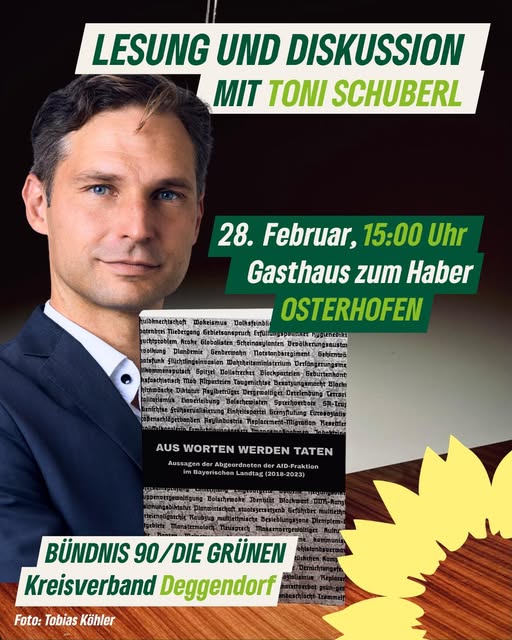 Gemeinsam mit seiner Fraktion hat er Reden der AfD-Abgeordneten systematisch ausgewertet und zahlreiche Belege für deren rechtsextreme Ideologie zusammengetragen. Seine Ergebnisse präsentiert Schuberl am SAMSTAG, 28. FEBRUAR 2026 in OSTERHOFEN (GASTHAUS ZUM HABER) – klar verständlich, belegt mit Originalzitaten und mit Blick darauf, wie man demokratisch dagegenhalten kann. Das Buch "Aus Worten werden Taten" bietet Schuberl auf seiner Webseite kostenlos zum Download an.